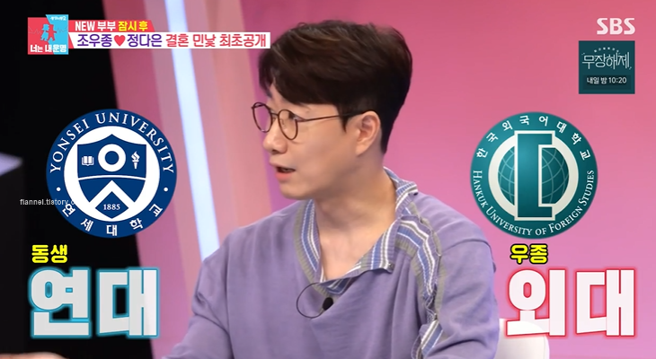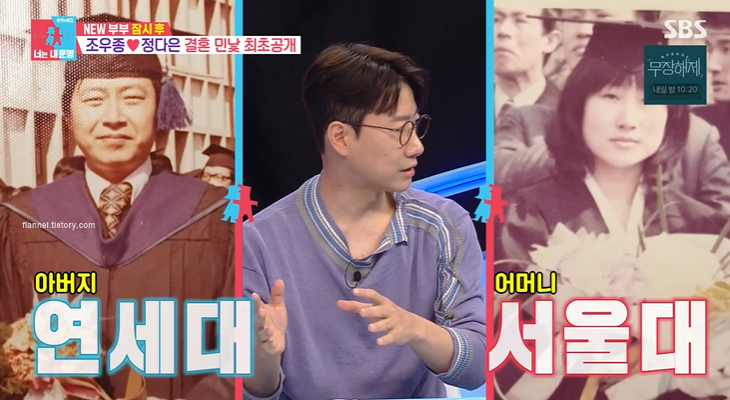 이날 조우종은 어마어마한 집안의 학력을 공개했어요. 아내 정다은은 서울대, 자신은 외대, 아버지는 연세대, 어머니는 서울대, 동생은 연대를 나왔다고 하네요. 또한 친척들은 하버드, 코넬, 브라운, 프린스턴을 다녔다고 밝혀 주위를 깜짝 놀라게 했어요. 어머니 직업은 조각가였다고 하네요.