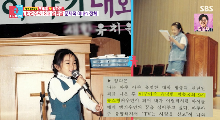 아내 정다은 또한 15년간 KBS 아나운서로 근무했어요. 현재는 그만두고 육아에 전념하고 있대요. 정다은은 어릴 적부터 꿈이 아나운서였대요. 전교 1등도 다수 했다고 하네요. 언어 수리 외국어도 만점! 수능을 단 3개 틀렸다고 하니 어릴 적부터 엄친아 맞았네요.