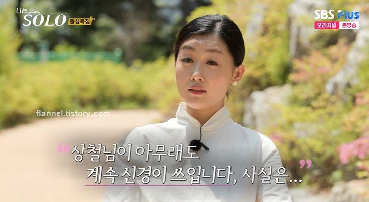 "모든 걸 계산해 보자면 솔직히 영호 님이 더 매력적이고 오랜 관계를 유지할 수 있을 것 같은 분은 영호 님이에요. 하지만 데이트라는 걸 상철님이랑 먼저 했고 상철님도 되게 표현을 잘하고 해서 상철님이 아무래도 계속 신경 쓰입니다 사실은"