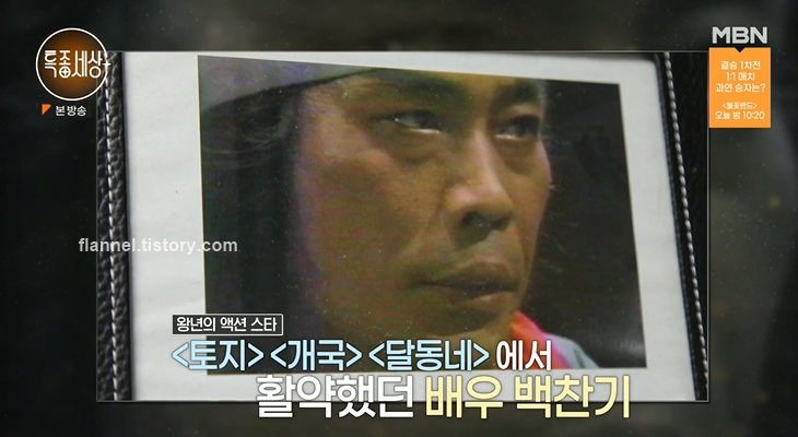 배우 백찬기가 '특종세상'을 통해 근황을 전했어요. 백찬기는 왕년의 액션 스타로 인기 드라마 '토지' '개국' '달동네' 등에 출연하며 큰 인기를 누렸는데요. 배우 장미희를 상대역으로 주연을 맡기도 했어요. 하지만 10년 전부터 방송에서 모습을 감춰 궁금증을 자아냈었죠.