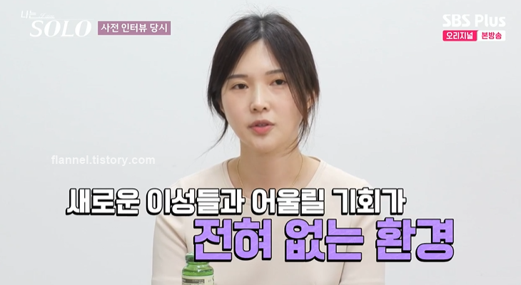 서울 종로에서 토익 강사로 자유롭게 일했던 옥순. 하지만 지금은 전혀 다른 환경에서 흑염소를 키우며 살고 있어요. 아버지 권유로 가족 사업을 잇게 되었다고 하네요. 자신은 사무실에서 혼자 일하면서 이성을 만날 수도 없는데, 솔로 나라 와서 비슷한 나이대의 연애사를 직접 보고 듣게 되니 본인에게 부족했던 경험치를 더욱 절실하게 느낄 수 있었대요.