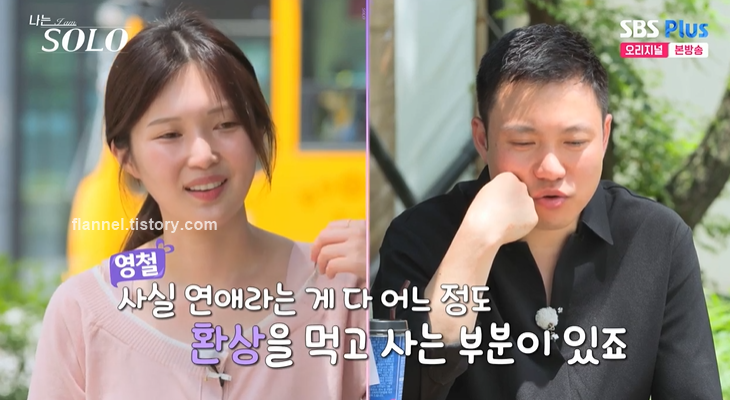 그러면서 옥순에 대해 "솔로 나라 밖이었으면 못 만났을 사람, 왠지 없을 것 같은 사람, 여기니까 어떻게 보면 운 좋게 만난 사람, 마음 표현 안 하면 이대로 바이바이다"고 덧붙였어요. 그러자 옥순은 자신의 좋은 점만 봐서 그런 거 아니냐며 웃었고, 영철은 "사실 연애라는 게 다 어느 정도 환상을 먹고사는 부분이 있죠"라고 답했어요.