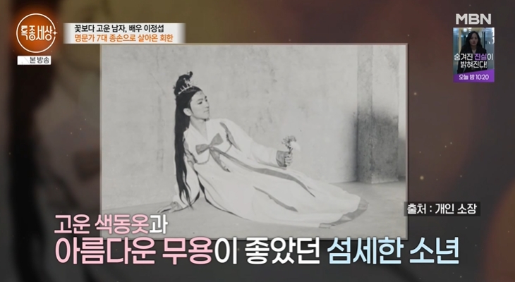 이정섭은 명문가 7대 종손이지만 어릴 때부터 고운 색동옷과 아름다운 무용을 좋아했어요. 남중, 남고를 다녔지만 연극반 활동에서 매번 여자 역할을 도맡아했다고 하네요.