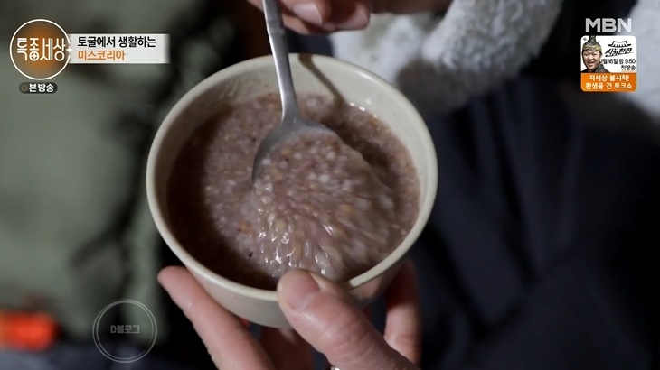 차우림은 작은 계곡에서 물을 담아 식수로 사용하고 있어요. 영하의 날씨에 맨손으로 손빨래도 하고 수수, 조, 보리 같은 날곡식에 물을 부어 불린 음식을 하루 한 끼 먹으며 생활하고 있죠. 설거지는 길에 쌓인 눈으로 해결하네요.