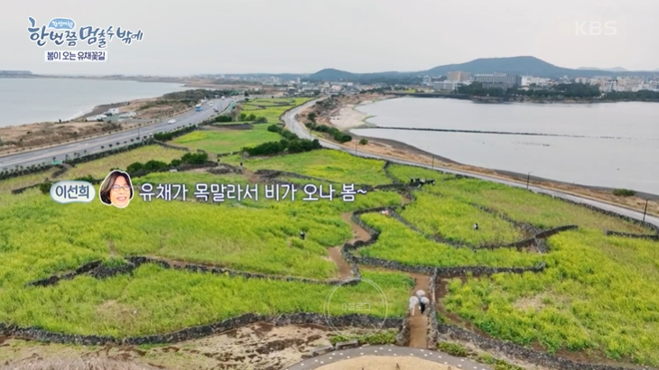 다음날 세 사람은 유채꽃밭을 찾았어요. 여기도 작년에 제가 갔던 곳인데 이름을 몰랐는데 유채꽃재배단지네요. 12월인데 왜 벌써 유채꽃이 있지? 했던 곳이에요. 우연히 발견했는데 돌담도 너무 예뻐서 사진으로 남겼어요. 성산일출봉을 배경으로 유채꽃과 사진도 남길 수 있어요.