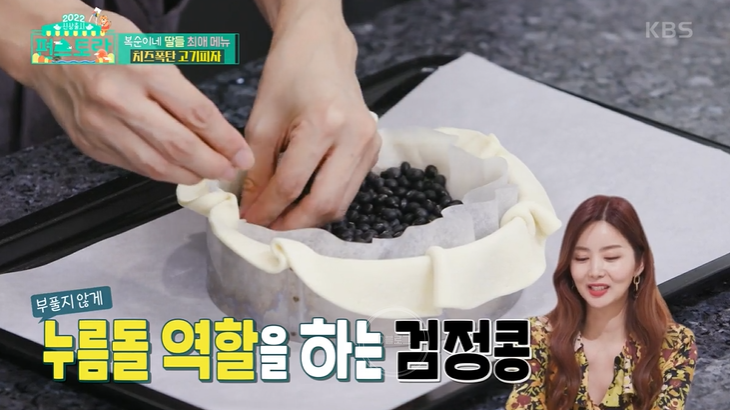 5. 반죽 위에 종이 포일 깔고 검정콩 넣기(부풀지 않게 누름돌 역할)
