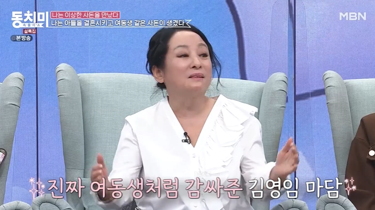 김영임이 29일 '동치미'에 출연했어요. 김영임은 '나는 아들을 결혼시키고 여동생 같은 사돈이 생겼다'는 주제로 이야기를 나눴는데요. 김영임 며느리는 가수 김윤지이죠. 두 집안은 원래부터 가족 같은 사이로 두터운 우정을 이어왔었대요. 그러다 김영임 아들과 김윤지가 결혼하며 두 집안은 사돈으로 다시 맺어졌죠.