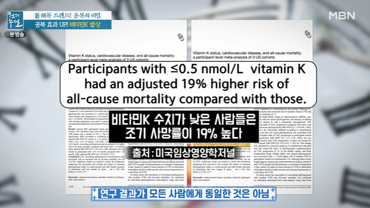 공복 첫 식사는 바로 '미나리 주스'. 약사 님은 미나리로 비타민K 밥상을 차린대요. 공복 첫 음식이 당질이 많거나 기름이 있으면 혈액을 끈적하게 만들어 혈관 독소를 쌓이게 한대요. 이는 곧 노화까지 가속화시키죠. 혈관 해독도 돕고 노화를 막아주는 3가지 요소를 충복하는 영양소가 바로 비타민K라고 해요. 실제 비타민K 수치가 낮은 사람은 조기 사망률이 19%나 높다고! 미나리 비타민K 함량은 양배추에 10배, 셀러리에 2.5배라고 해요.