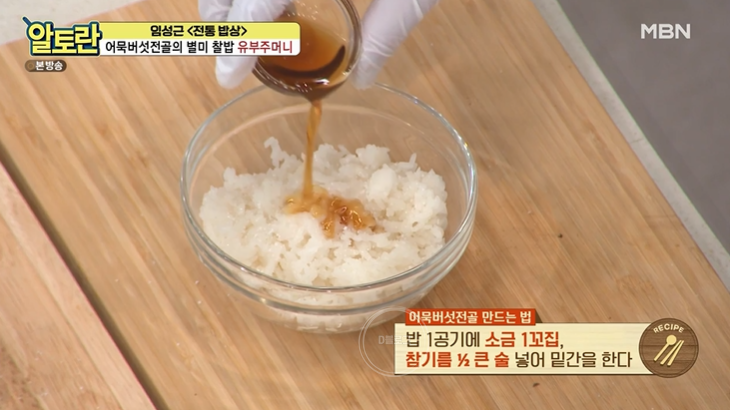 17. 찹쌀밥 1공기에 소금 1꼬집, 참기름 1/2큰술 넣어 밑간 하기