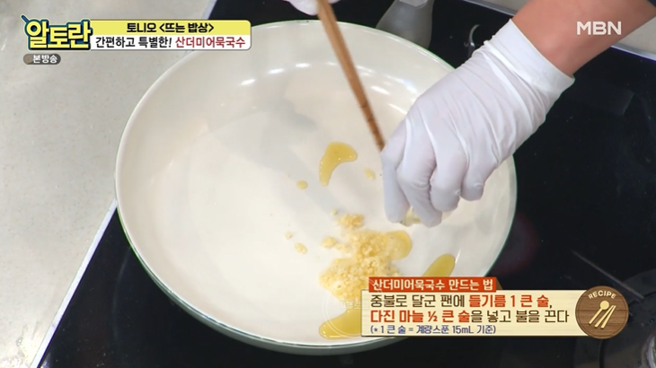 8. 중불로 달군 팬에 들기름 1큰술, 다진 마늘 1/2큰술 넣고 불 끄기