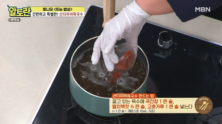10. 끓고 있는 육수에 국간장 1큰술, 멸치액젓 1/2큰술, 고춧가루 1큰술 추가