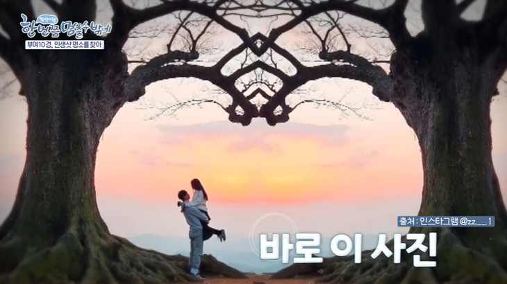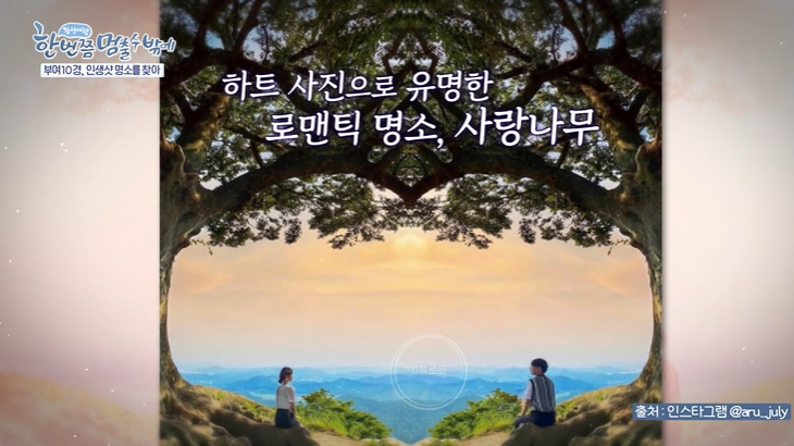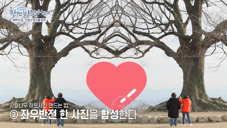나무가 하트 모양은 아니고 편집해서 만든다고 하네요. 사랑나무를 찍은 뒤 좌우반전 한 사진을 합성하면 완성! 특히 노을질 때 가면 정말 인생샷 남길 수 있겠어요. 잔나비 최정훈 도움으로 이금희도 성공!