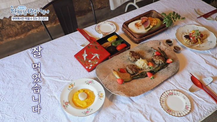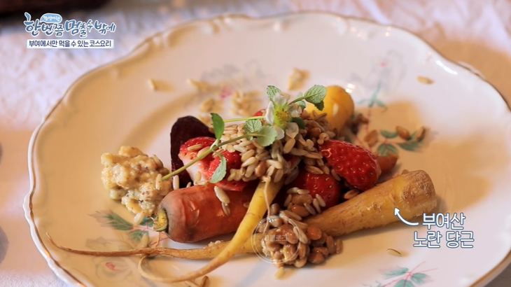 첫 번째 음식은 단호박 수프 위에 익힌 마 한 조각을 올린 단호박 수프! 아침에 볶은 깨를 솔솔 뿌려 먹는 게 포인트네요. 두 번째 요리는 데친 당근, 귀리, 딸기, 낫토 샐러드! 생각지도 못한 조합이네요. 그리고 부여 한우로 만든 떡갈비와 무채 나물까지! 건강하게 배부른 한 상이네요.