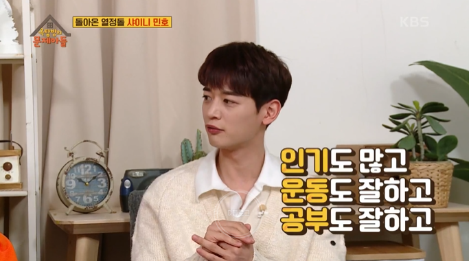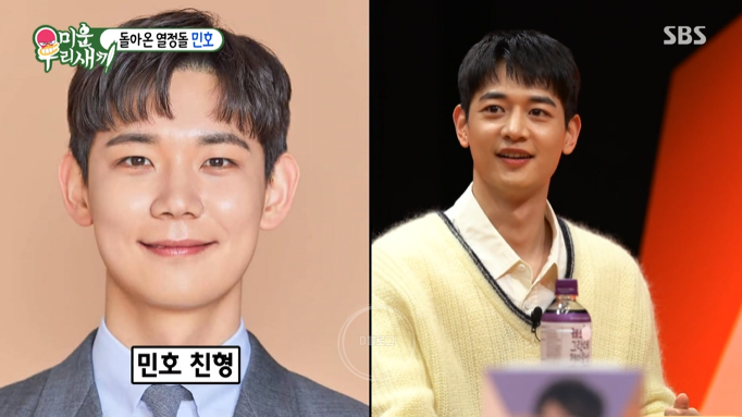 형 보다 잘하는 게 있어요?라는 물음엔 "제가 고등학교 때 데뷔를 했어요. 그때 형이 대학교를 들어갔는데 제가 활동을 열심히 하고 있을 때니까 자기 이름으로 불리는 게 아니라 '민호 형'으로 불렸대요. 형이 그거에 스트레스를 많이 받았나 봐요. 술 먹다가 저한테 사람들이 내 이름을 안 불러주고 민호 형이라고만 부른다. 근데 저는 내심 좀 기쁜 거예요" ㅋㅋㅋ
