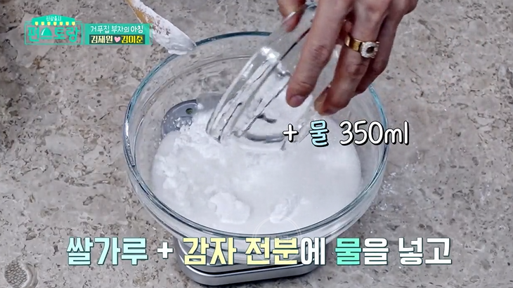 1. 쌀가루 2(100g): 감자 전분 1(50g) 비율에 물 350ml 넣고 저어주기