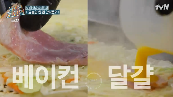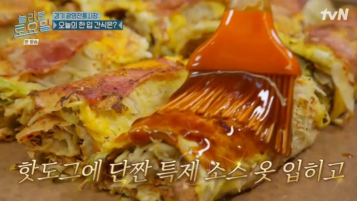 진짜 비주얼 터진다! 케첩, 마요네즈, 가다랑어포, 새우 번갈아 쫙쫙 올리면 호불호 없는 간식 완성이네요. 와 이건 진짜 먹어보고 싶어요! 오코노미야키와 부침개 중간 정도의 맛이래요.