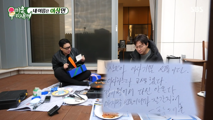 그런데 편지에는 '상민아 이사기념 선물이다. 이사하느라 고생했다. 집이 멀어서 다신 안 온다. 마지막 선물이니까 잘 간직해'ㅋㅋㅋㅋㅋㅋ 감동한 이상민이 "형 내 남편 할래?" 하니까 탁재훈 "안 해. 그럼 나 괜히 손찌검할 거 같애"ㅋㅋㅋㅋㅋㅋㅋㅋㅋㅋㅋㅋㅋㅋㅋㅋㅋㅋㅋㅋㅋ