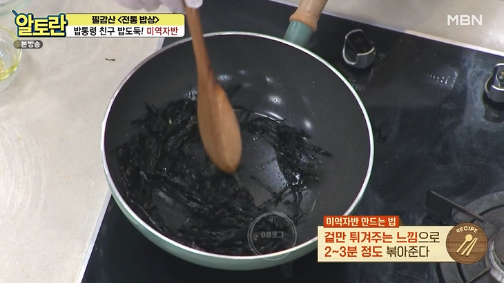 3. 마른미역 넣고 약불에 겉만 튀겨주는 느낌으로 2~3분 볶기 (미역 한 개 넣고 지글지글거리면 그때 넣기)