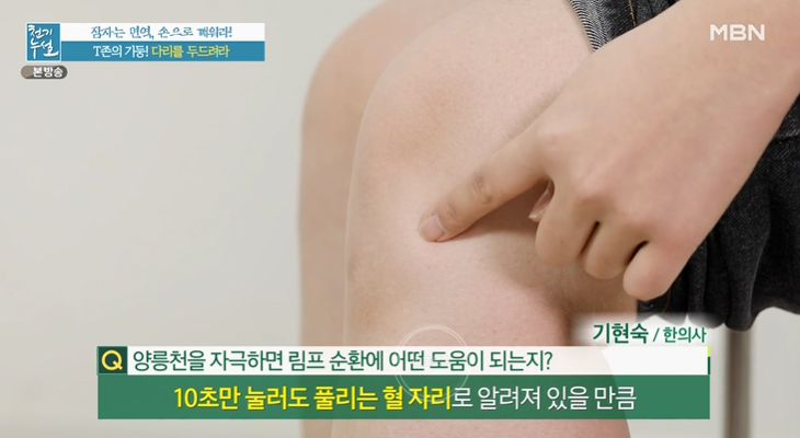양릉천은 종아리 쥐가 날 때 10초만 눌러도 풀리는 혈 자리로 알려져 있음. 전신 순환에 도움이 되는 혈 자리. 손으로 특히 집중해 두드려 주면 전신 T존의 림프 순환 효과를 더 증가시킬 수 있음.