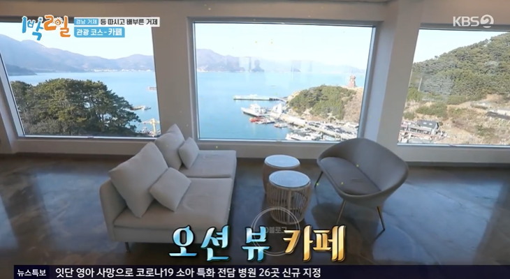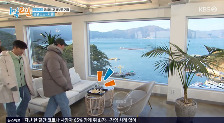 '1박2일' 거제도 편에 아름다운 풍경의 카페가 소개됐어요. 전면이 탁 개방된 아찔한 뷰에 맛있는 디저트까지! 창문 너머로 거제 명소 '바람의 언덕'이 한 눈에 내려다 보이네요. 여기에 에메랄드빛 푸른 바다까지 로맨틱.