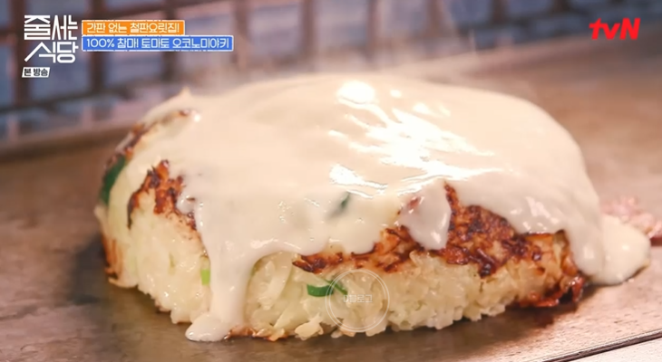겉만 익힌 마 반죽에 치즈를 올리고 뚜껑을 덮어 속까지 찌듯이 구워내요. 이것이 촉촉한 식감의 비법! 그리고 인스타에서 화제가 된 특제 토마토소스를 가득 올려줘요. 이 식당의 오코노미야키는 반죽에 밀가루가 안 들어가서 바삭한 식감보다 부드러운 식감이래요. 100% 마로 반죽한다고! 박나래 말로는 엄청 건강한 맛이래요!