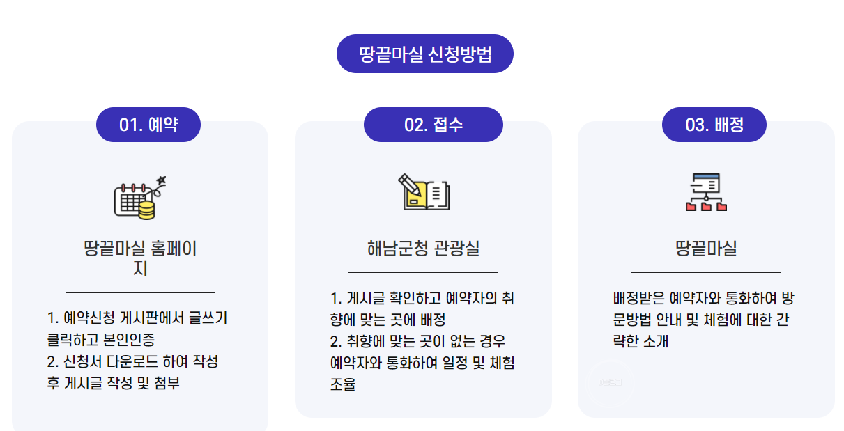 홈페이지 예약 신청 게시판에서 글쓰기 클릭하고 본인 인증 > 신청서 다운로드 작성 후 게시글 작성 및 첨부/ 해남군청 관광실에서 게시글 확인 후 예약자 취향에 맞는 곳 배정/ 배정 받은 예약자와 통화, 방문방법 안내 및 체험 소개