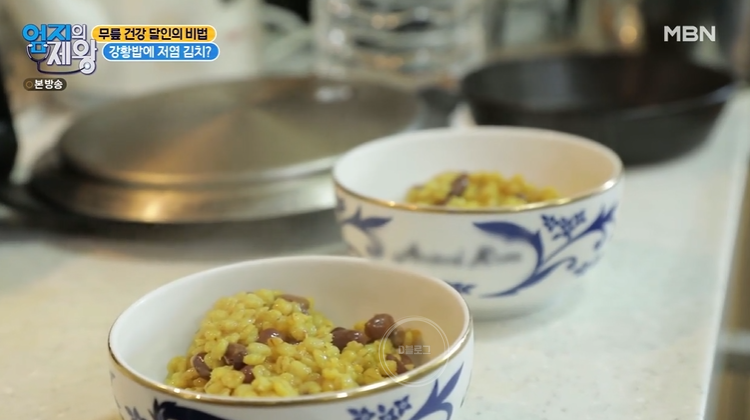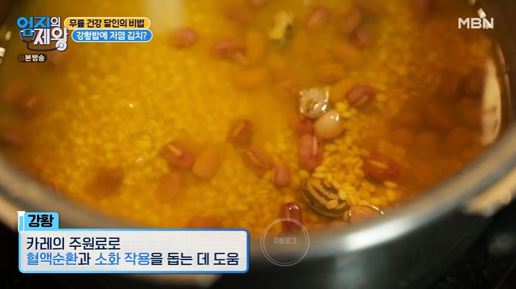 건강 달인은 밥 짓는 방법도 다르네요. 보리, 팥, 강황을 넣고 밥을 지으신 대요. 카레 주원료인 강황은 혈액순환과 소화 작용을 돕는 데 도움을 준대요.