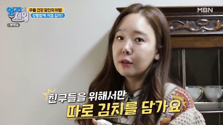 강황밥과 어울리는 저염 김치 만들기! 죽을 쑨 육수에 배, 사과, 무, 양파, 액젓 넣고 갈아주기. 여기에 고춧가루를 넣고 섞어요. 그리고 배추를 버무리면 저염 겉절이 완성! 소유진은 엄마 김치가 맛있어서 친구들을 위해서만 또 따로 김치를 담근대요.