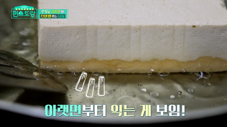 4. 예열된 프라이팬에 두부 1모 투하, 아랫면부터 익히기