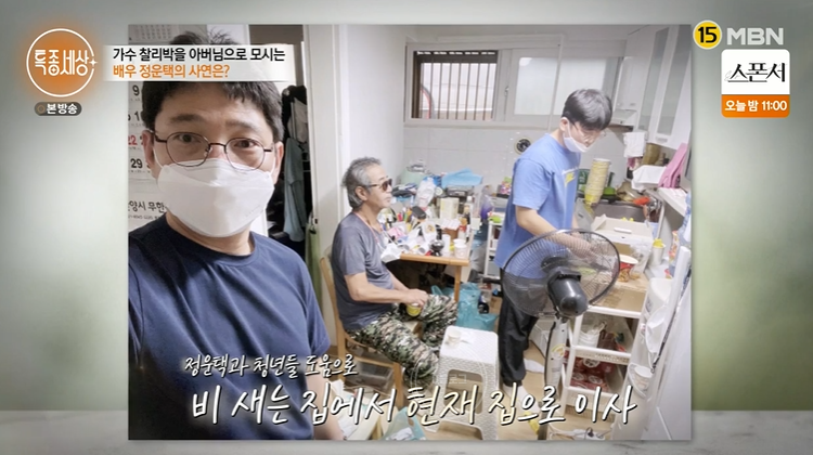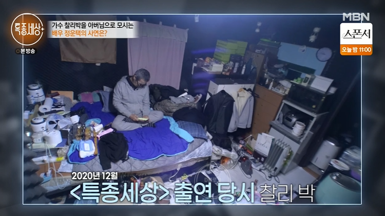 오늘도 장을 한보따리 사서 찾아간 곳은 전진의 아버지 찰리박이 사는 곳이었어요. 아들 전진의 아버지로도 유명한 찰리박은 가수 겸 작사가로, 현재는 빌라 지하방에서 거주하고 있어요. 정운택과는 2년째 인연을 이어오고 있다고 하네요.