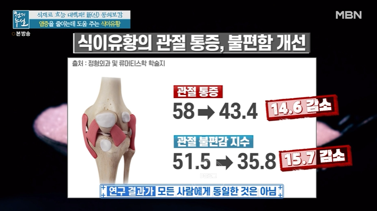 인체 내 황 성분이 가장 많이 분포된 곳은 관절과 연골. 나이 들수록 황 성분이 줄어들고 체내 부족할수록 관절과 연골 속에 있는 황 성분을 빼서 쓰기 때문에 관절염 유발하거나 악화시키는 원인이 됨. 식이유황 꾸준히 섭취하면 관절 속 황 성분을 채우는데 도움이 될 뿐만 아니라 강력한 염증 제거를 돕는 글루타티온 성분이 작용해 관절염 완화와 연골 손상 예방에 도움이 될 수 있음. 실제 관절 통증, 불편감 지수가 감소했다는 연구 결과도 있음.