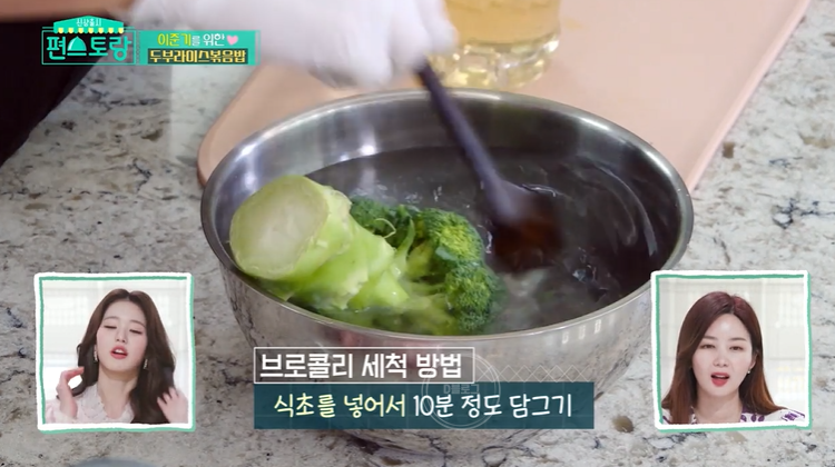 4. 스테인리스 볼에 식초 1T 추가, 브로콜리 1개 뒤집어서 10분 담가주기