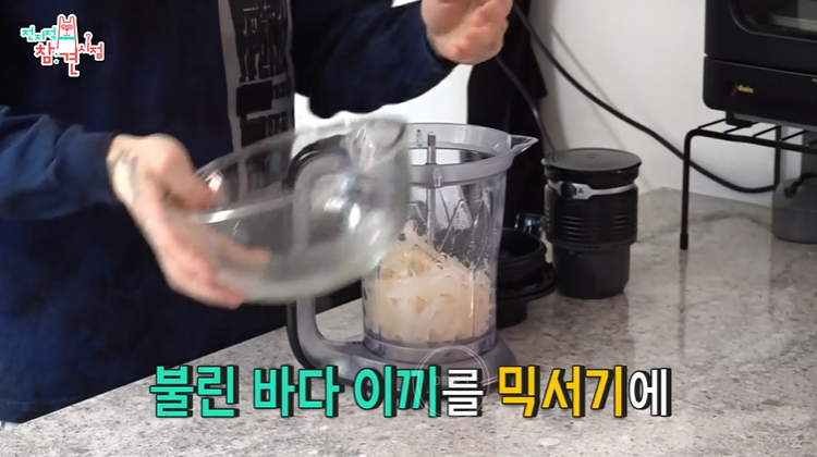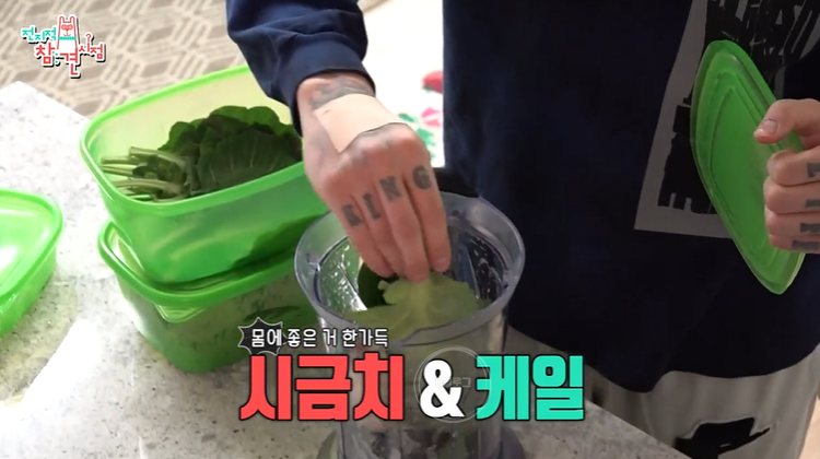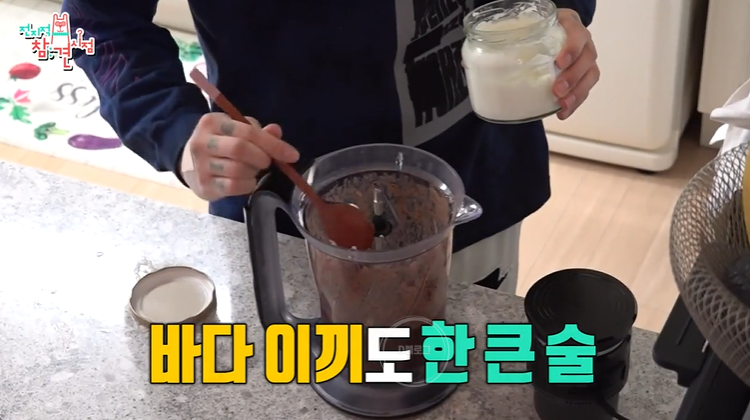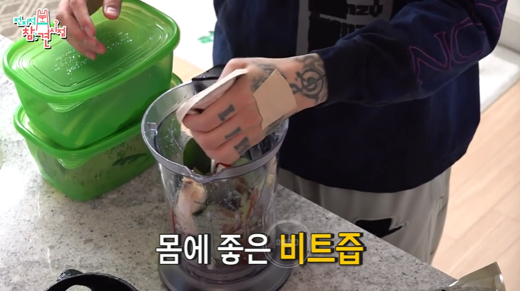 그리고 냉장고에서 어제 만든 바다 이끼 젤을 꺼낸 박재범은 다양한 식재료로 스무디를 만들기 시작했어요. 재료들 모두 넣고 믹서에 갈면 완성!
