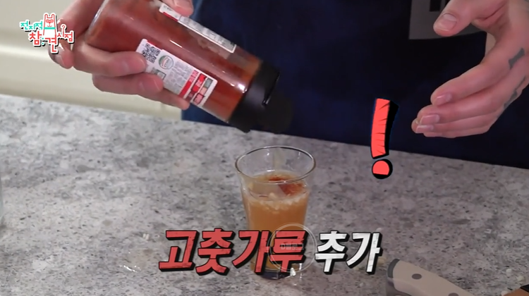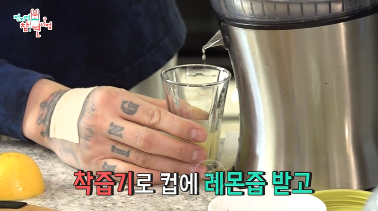 박재범의 두번째 건강습관 '마늘 샷' 먹기. 먼저 마늘을 오븐이나 렌지에 5초간 가열해요. 그리고 잘게 다져요. 레몬은 착즙기로 레몬즙 받기. 마누카꿀을 레몬즙에 한 숟갈 타요. 그리고 다진 마늘, 고춧가루 추가하면 완성!
