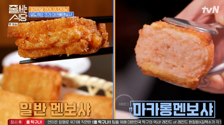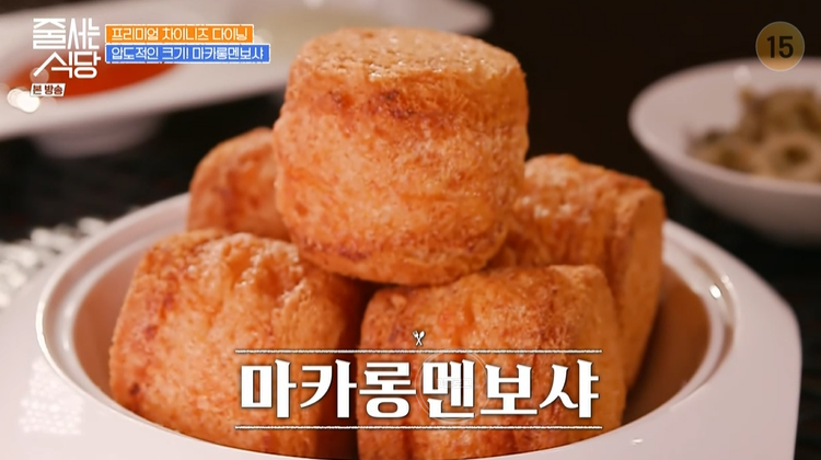 다음 메뉴는 압도적 크기의 마카롱 멘보샤! 신선한 알새우를 잘게 다져 빵 사이에 가득 넣어요. 그리고 그대로 기름에 퐁당! 다른 멘보샤와 달리 빵이 얇고 속이 두툼하네요. 새우 살이 그대로 느껴져서 통새우를 먹는 느낌이래요.