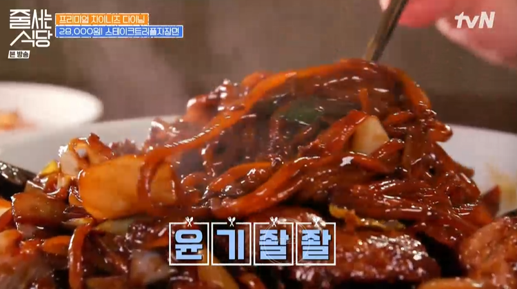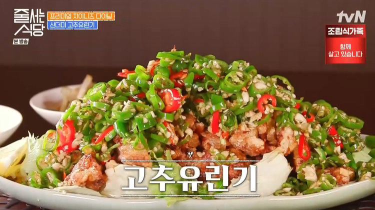 두 번째 메뉴는 입이 쩍 고추 유린기! 12시간 숙성한 닭다리살을 튀기고 위에 청양고추를 가득 올려요. 비주얼은 물론 맛까지 모두 잡았다고! 엄청 맵지 않을까 싶었는데 맛있게 매콤한 정도래요. 소스에 담겨 있어도 바삭함이 그대로라고.