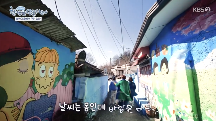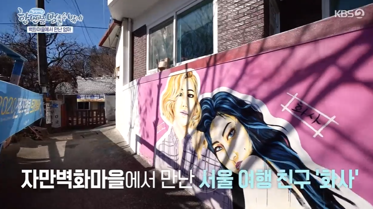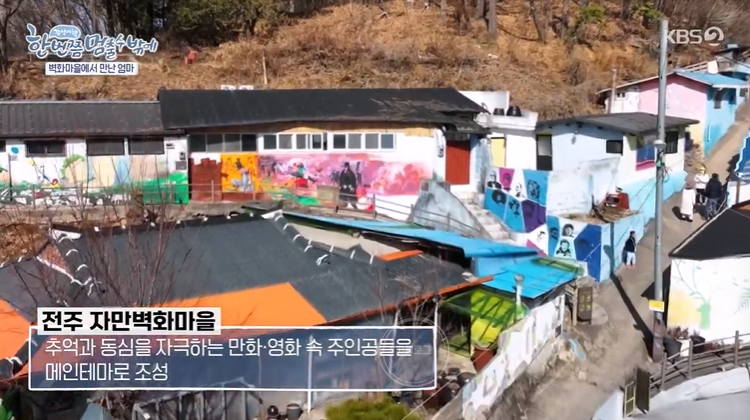 세 사람이 비빔밥 와플 먹고 산책한 곳은 전주 자만벽화마을이에요. 전주 한옥마을과 도로 하나를 사이에 두고 산비탈에 위치했네요. 추억과 동심을 자극하는 만화, 영화 속 주인공들을 메인 테마로 조성했대요. 전주 출신 마마무 화사, 휘인 그림도 있네요ㅋㅋㅋ