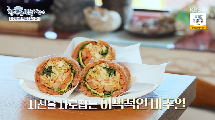전주 대표 음식 비빔밥을 새로 알리기 위해 고안한 메뉴라고 하네요. 세 사람은 처음 접한 특이한 식감에 놀람 놀람.