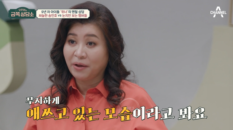오은영 "저는 의외로 민호 씨가 무지하게 애쓰고 있는 모습이라고 봐요. 왜냐하면 지금 약간 상태가 힘들어요. 에너지 수치가 200이라면 지금은 100밖에 안 돼요. 세 명의 멤버가 싫은 게 아니라 본인이 상태가 좀 힘든 거예요. 옆에서 누가 왔다 갔다 하는 것만으로도 에너지를 뺏겨. 그러니까 본인이 에너지를 보존하려고 약간 거리를 두고 떨어져서 어떤 것에 몰두하면서 세이브하고 있는 느낌이 들어요"