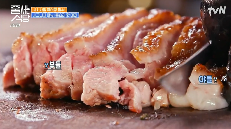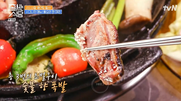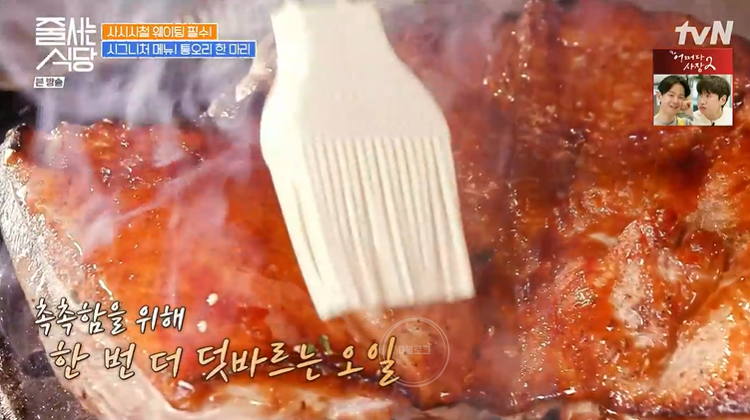 첫 번째 메뉴가 나왔어요. 호불호 강한 오리고기로 20대 젊은 입맛을 저격한 비결은 초벌에 있어요. 손님에게 나가기 전 두 번 구워내 잡내 없는 특유의 불맛을 입혔다고. 오리고기는 손님 상에서 3차 초벌구이 돼요. 엑스트라 버진과 참기름을 섞은 기름을 위에 슥슥 발라주면 풍미 업업!