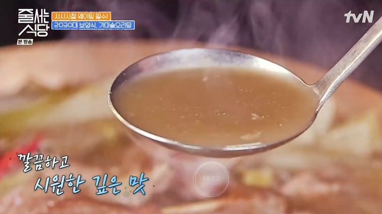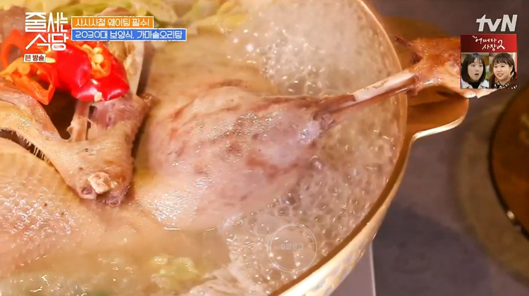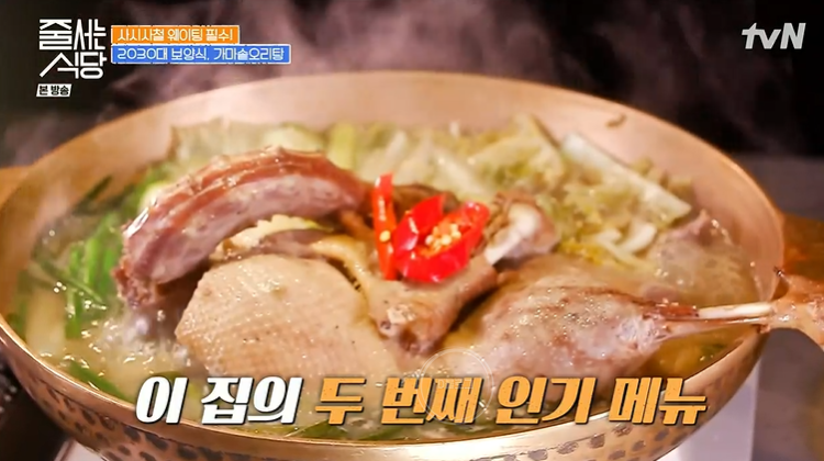 두 번째 인기 메뉴는 갖은 채소에 오리고기를 올려 육수 넣고 끓인 가마솥 오리탕! 가마솥에 약재와 오리뼈를 넣고 푹 삶아 육수를 만든대요. 힙한 분위기에 오리탕 무슨 일? ㅋㅋㅋ