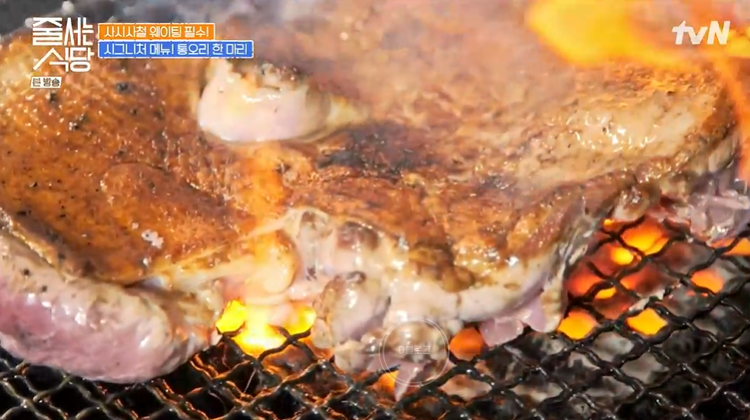 통오리는 손님상 앞에서 썰어줘요. 오리고기는 많이 먹을 일이 없는데 맛이 정말 궁금하네요. 썬 오리는 불판에 올려 지글지글 구워주기! 오리향 대신 숯불향만 난대요. 오래 싫어하는 사람도 거부감 없이 먹을 수 있겠어요.