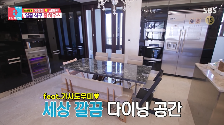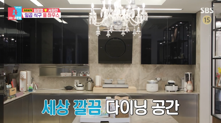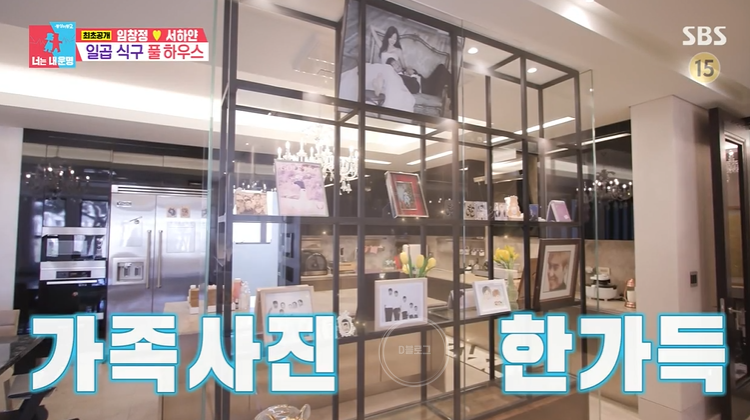 거실 옆엔 블랙&화이트 주방! 조명이 너무 고급스럽고 엔틱하네요. 아이가 다섯인데도 세상 깔끔해요! 자막에 가사도우미가 있는데 가사도우미가 따로 있는 건지? 투명 팬트리는 가족사진으로 가득 찼네요.