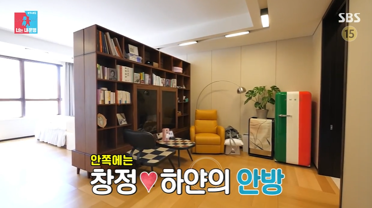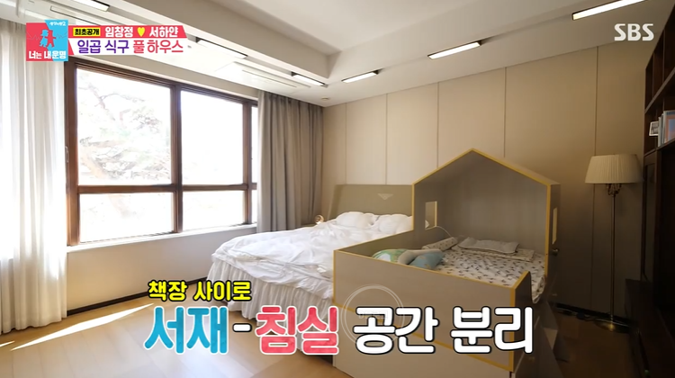 그리고 부부의 안방! 가운데 책장을 경계로 침실과 서재를 분리했네요. 그런데도 공간이 널찍해서 막내 침대까지 들어가네요.