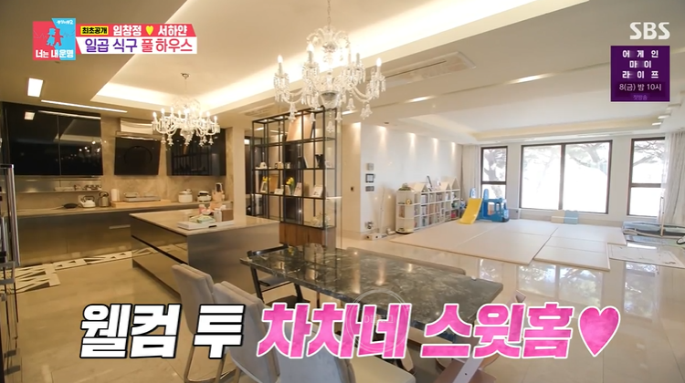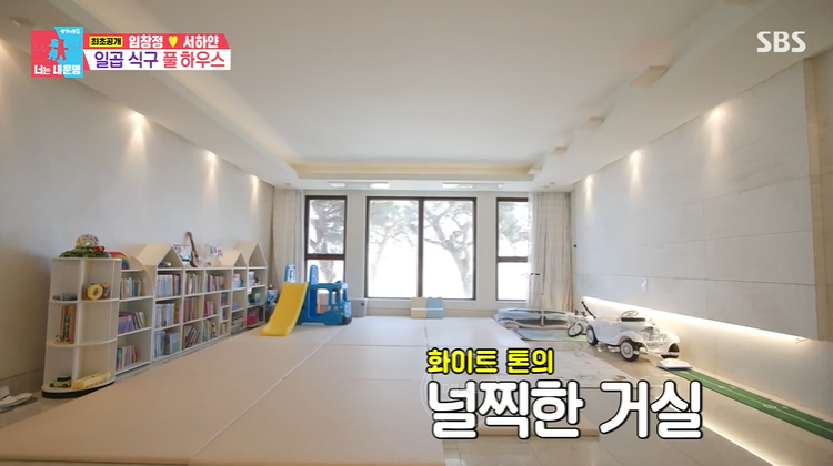 임창정, 서하얀 부부가 일산에 위치한 집을 공개했어요! 널찍한 거실은 화이트 톤으로 깔끔하게 인테리어 됐지만 오형제 전용 장난감과 책으로 가득하네요.