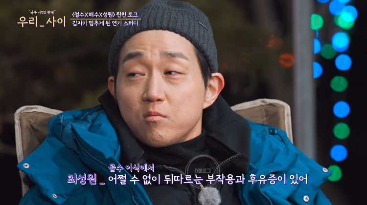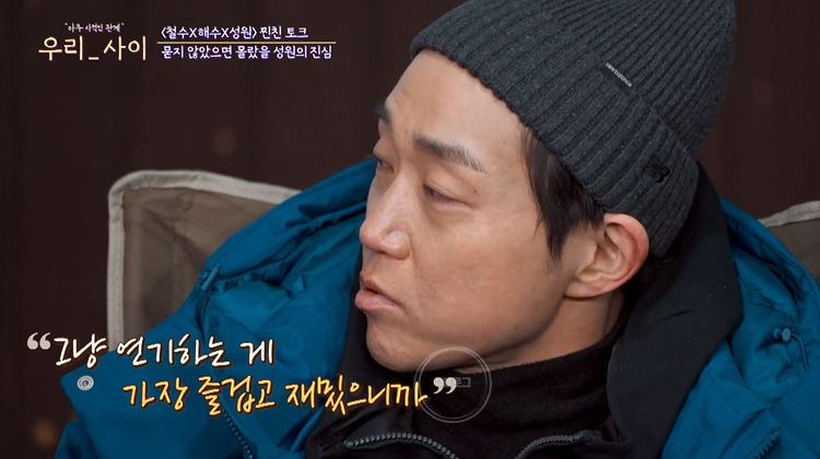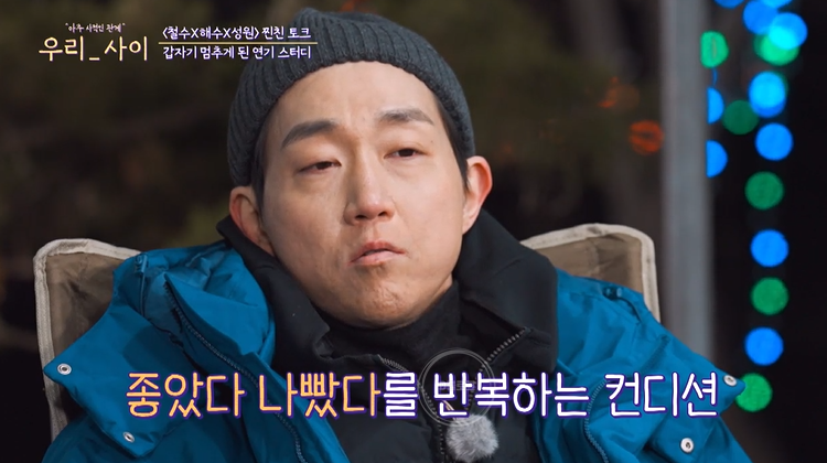 배우 최성원이 '우리 사이'에 출연해 백혈병 투병 사실을 고백했어요. 최성원은 배우 임철수 친구로 박해수와 함께 출연했는데요. 세 사람은 2014년 배우 집단 '하고 싶다'에서 함께 활동하며 우정을 이어왔어요. 임철수는 박해수와 10년 동거한 사이로 지금도 하루에 3~4번씩 통화한대요. 최성원과는 10년 지기 친구로 자신과는 천적이래요ㅋㅋㅋ