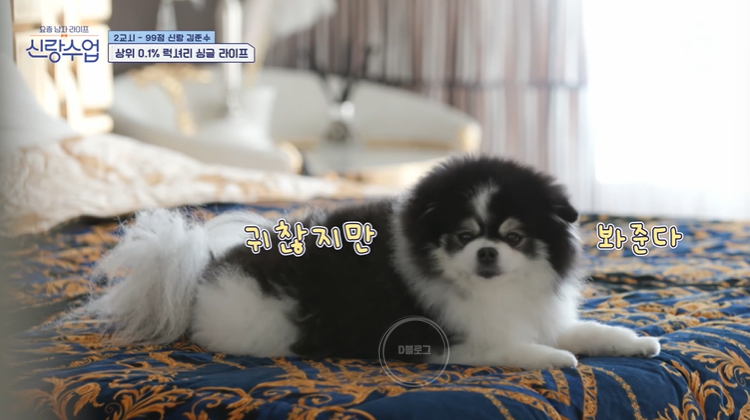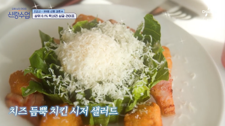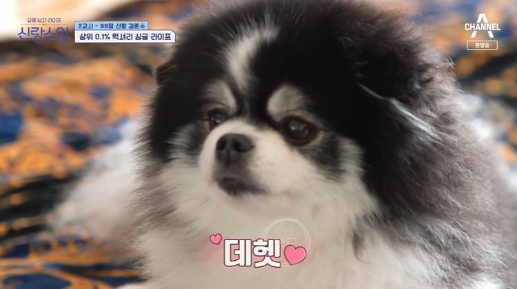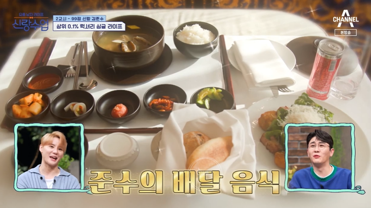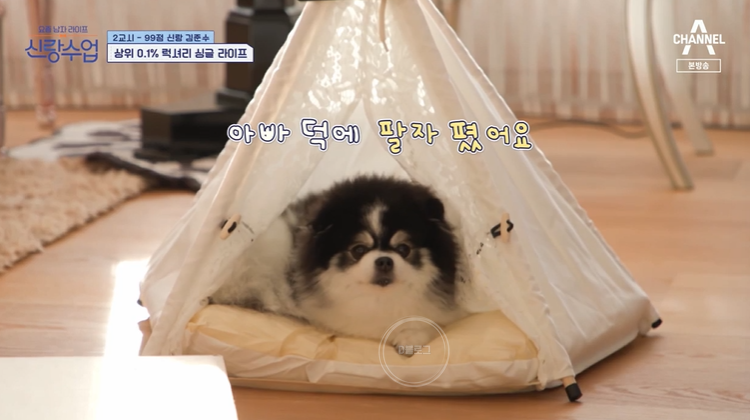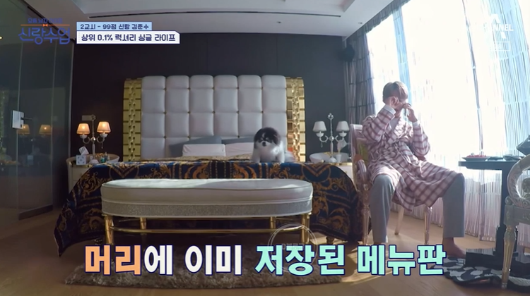 치즈 듬뿍 치킨 시저 샐러드랑 전복이 통째로 든 갈비탕! 24시간 룸서비스가 운영된대요. 밥 먹을 때도 츄 비주얼 무슨 일! 츄를 위한 집도 만들어줬네요.