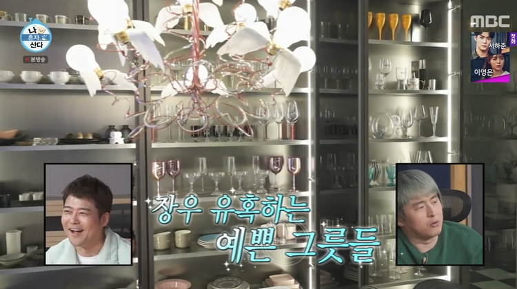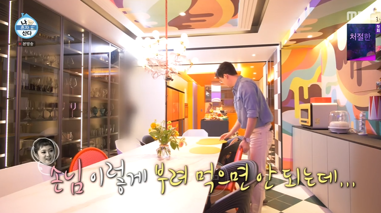 그리고 대망의 주방! 천장까지 그림을 넣어 전체적으로 너무 세련돼요! 조명도 진짜 센스 있게 골랐네요. 한 벽면은 전부 그릇들로 가득. 요리를 좋아해서 그런지 그릇 모으는 게 취미래요.