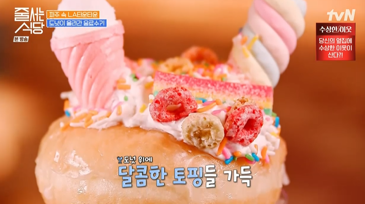 오늘의 첫 번째 가게는 화려한 외관을 자랑하는 파주 도넛 카페! 다양한 비주얼 도넛이 단번에 눈길을 사로잡네요. 최근 인스타에 핫하게 떠오르고 있는 파주 여행지래요!