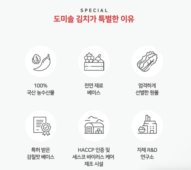 도미솔김치는 100% 국내농수산물을 이용해요.
